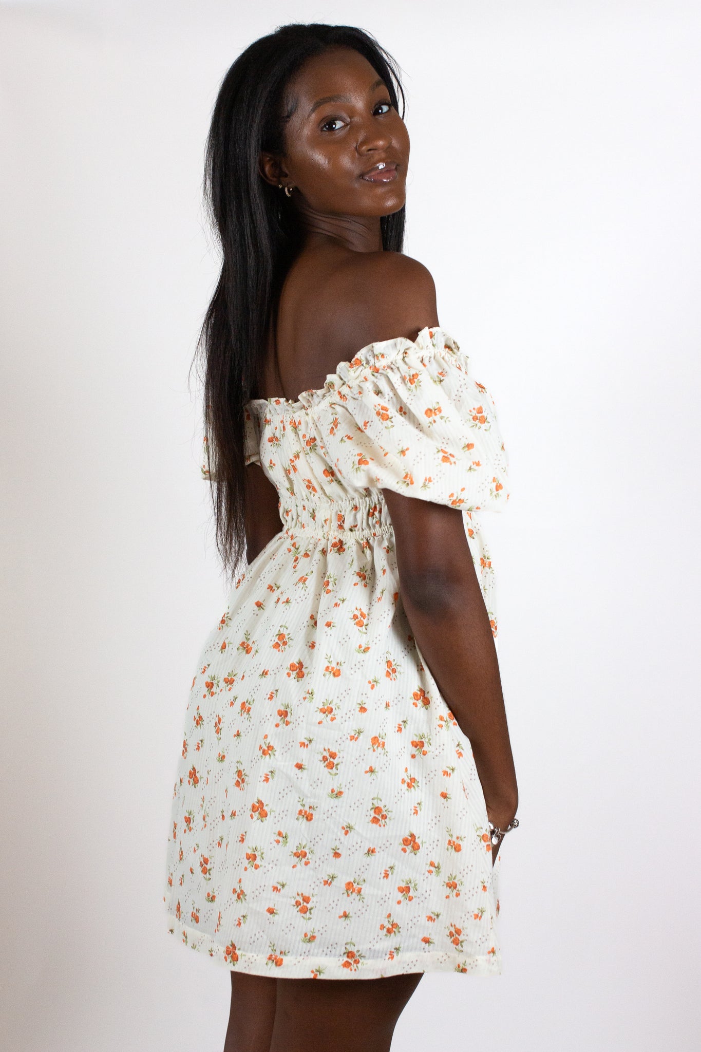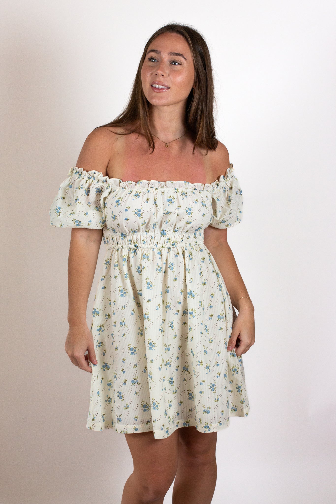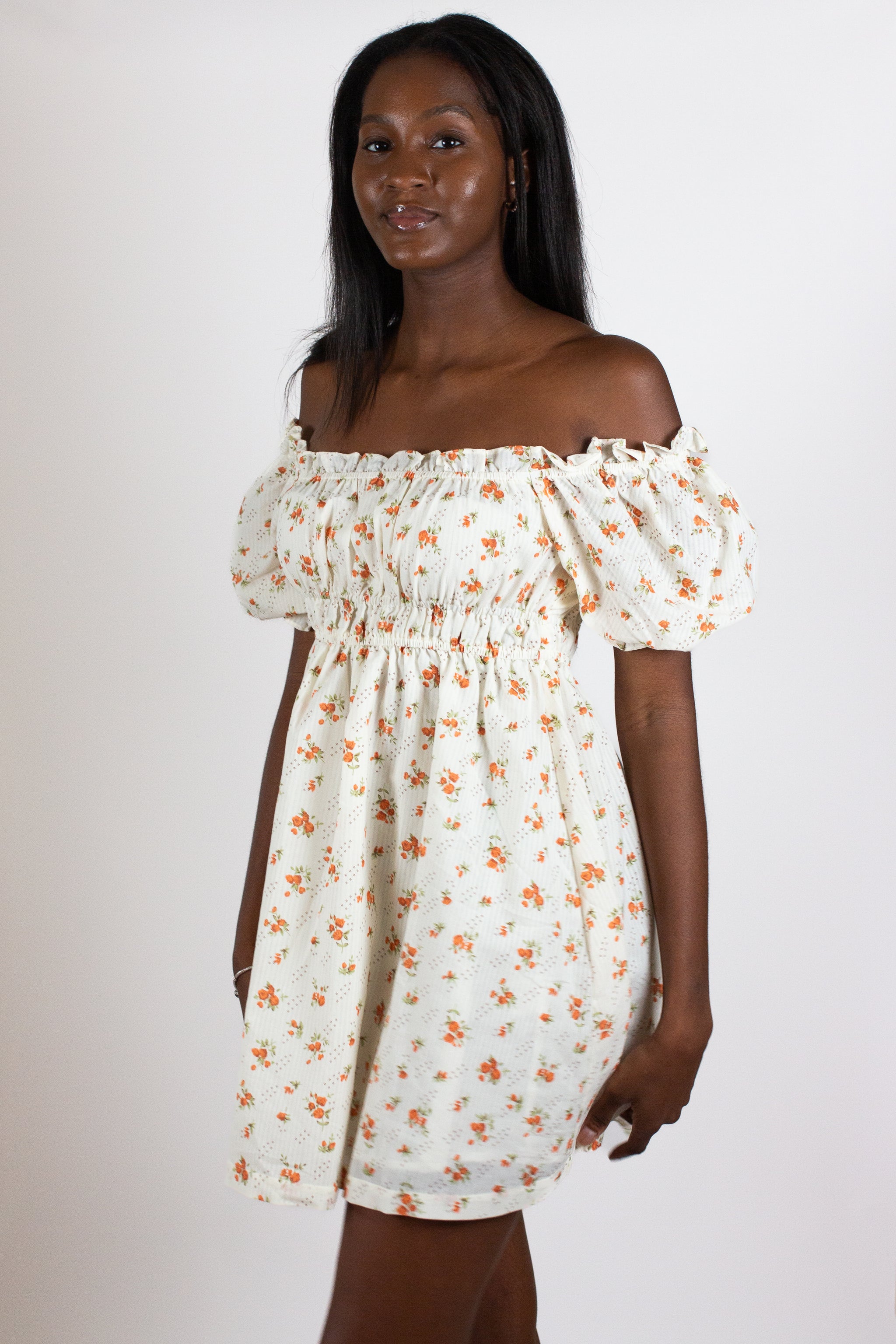 Embrace effortless femininity with a touch of floral charm. Featuring an off-shoulder neckline and a flirty babydoll silhouette, this dress exudes romantic elegance. Crafted with lightweight fabric adorned with a delicate floral pattern, it offers comfort and breathability for all-day wear.